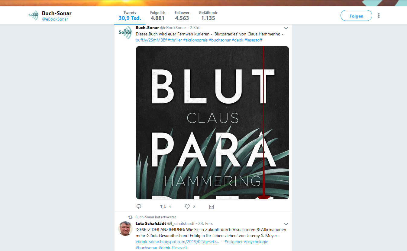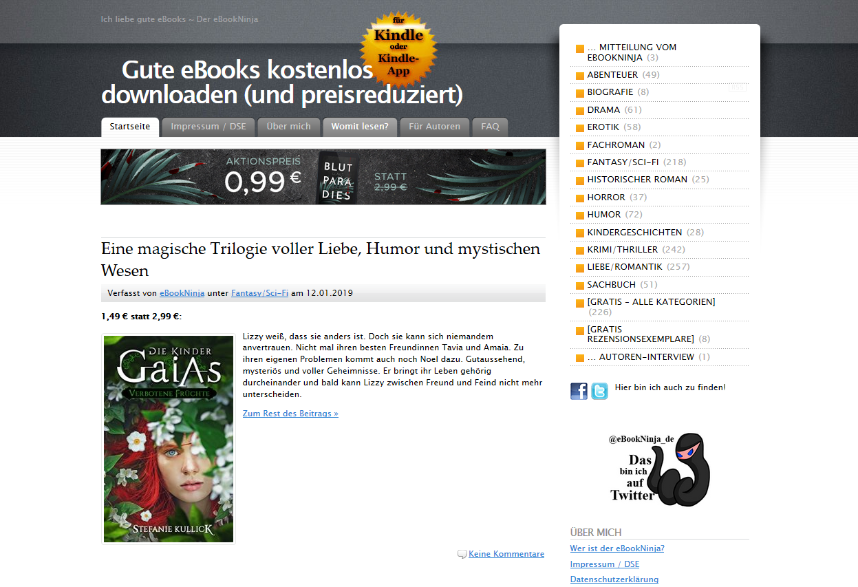 Der gebuchte Banner auf ebookninja.de taucht auch um 13:00 Uhr noch nicht auf der Website auf, also hake ich mal nach. Gegen 17:00 Uhr ist er online. Am nächsten Tag (21.02.) sollen noch ein Facebook-Post und ein Beitrag auf der Website folgen.