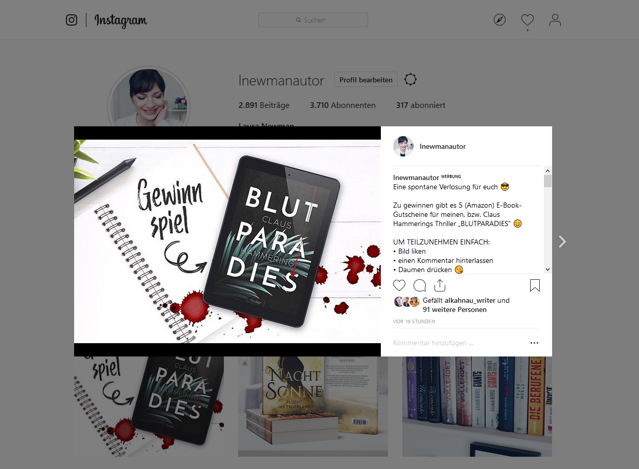 An diesem Tag feuert Buch-Sonar seine Blutparadies Posts ab, während ich immer nervöser werde. Nur noch drei Tage bis zur lesen.net Anzeige und es geht weiter bergab. Ich hatte es ohnehin geplant, doch jetzt ist es wirklich sinnvoll – ich starte ein kleines Gewinnspiel auf Instagram.