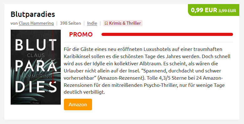 Der Morgen danach. Blutparadies hat es auf Platz #264 geschafft und verzeichnet vor 9:00 Uhr 12 Verkäufe. Ein naiver Teil von mir kann sich vorstellen, dass noch immer die Möglichkeit besteht, in die Top 100 zu gelangen. Aber realistisch wäre dies wohl nur gewesen, wenn die lesen.net Aktion ein paar Tage früher stattgefunden hätte, als das E-Book im Ranking noch bei #1000 lag.