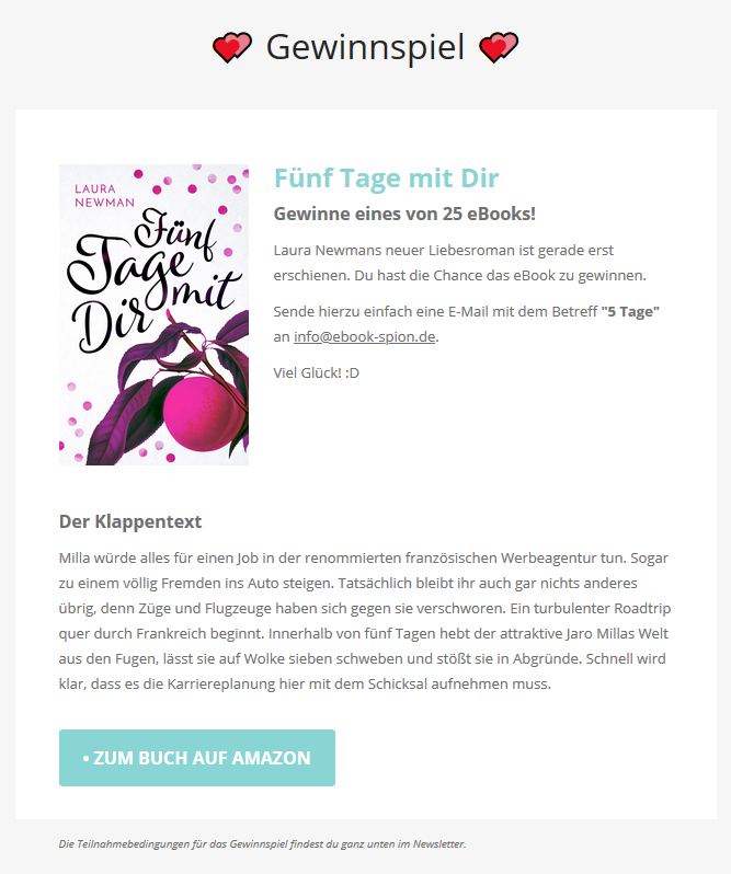 - Das E-Book erscheint im eBook Spion Newsletter und wird dort im Rahmen einer Verlosung verlost