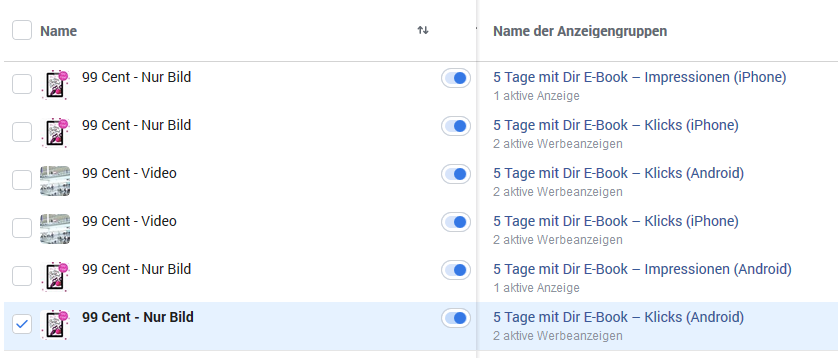 Da iPhone und Android User unterschiedliche Produktlinks benötigen, um das E-Book auf dem Handy kaufen zu können, und ich eine nur-Bild und eine Video-Werbeanzeige erstellt hatte, laufen zu diesem Zeitpunkt sechs Anzeigen parallel. Zwei davon zielen jedoch nicht auf Klicks/Käufe, sondern schlicht auf massenweise Impressionen ab. Das Buch soll so oft es geht angezeigt werden. Nach diesen ersten Tagen kann ich nun ein wenig auf die Bremse treten, deutlich ineffiziente Anzeigen abschalten und nur die optimale Konfiguration weiterlaufen lassen.